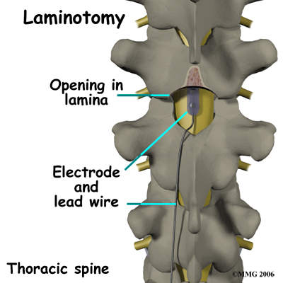 Spinal cord stimulation can be thought of as blocking the pain signal as it travels up the spinal cord to the brain. The small stimulator device is similar to a pacemaker and is implanted underneath the skin, usually in the lower abdomen or upper buttock. The device is connected to special electrodes that are positioned over the back of your spinal cord by wires placed inside the spinal canal. The stimulator device delivers an electrical current to the electrodes that interrupts the conduction of the pain signal, replacing the pain with a tingling, or buzzing sensation, which is often soothing. The electrical stimulation serves as a distraction and allows your brain to focus on the tingling rather than the painful pain signals.