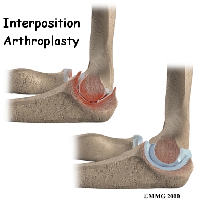Elbow arthritis may be surgically treated with a procedure called interposition arthroplasty. The term interposition means that new tissue is placed between the damaged surfaces of the elbow joint. In this surgery, tissue is taken from another source to fill in the space in the elbow joint. The soft tissue forms a false joint. This surgery has best results in younger people with healthy tissue around the elbow joint.