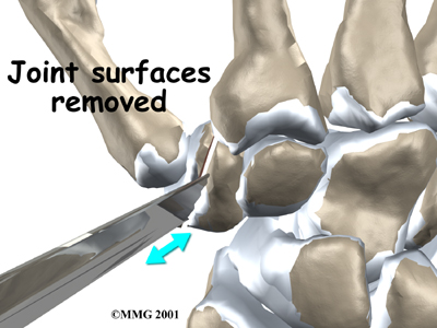 In this procedure, an incision is made across the base of the thumb. The soft tissues are spread apart with a retractor. Special care is taken not to damage the nearby nerves going to the thumb. The joint capsule is opened, exposing the CMC joint. The ends of the bones that form the CMC joint surfaces are taken off, forming flat surfaces.