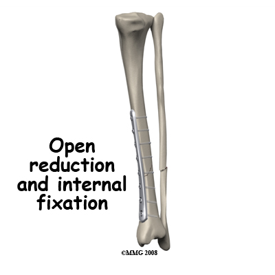 Sometimes the degree of shortening or rotation may not be acceptable. Treatment would then require surgical correction of the malalignment. Surgical correction of a malunion requires cutting the bone, restoring the alignment then fixing the tibia using either internal fixation with a plate, intramedullary rod or external fixation device. These methods are usually successful in correcting the problem and giving a good long-term outcome.