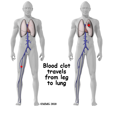 Thrombophlebitis, sometimes called deep venous thrombosis (DVT), can occur after any operation, but is more likely to occur following surgery on the hip, pelvis, or knee. DVT occurs when blood clots form in the large veins of the leg. This may cause the leg to swell and become warm to the touch and painful. If the blood clots in the veins break apart, they can travel to the lungs, where they lodge in the capillaries and cut off the blood supply to a portion of the lung. This is called a pulmonary embolism. (Pulmonary means lung, and embolism refers to a fragment of something traveling through the vascular system.) Surgeons take preventing DVT very seriously. There are many ways to reduce the risk of DVT, but probably the most effective way is to get you moving as soon as possible after surgery. Moving means getting you up out of bed to sit in a chair and to walk as soon as you are able, but it also includes having you perform ankle circles and ankle pumping exercises while lying down or sitting, which also helps to keep the fluid moving in your legs. Two other commonly used preventative measures include pressure stockings, as described above, and medications that thin the blood and prevent blood clots from forming.