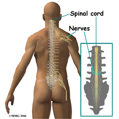 When doing an ESI, the doctor inserts a needle through the skin so that the tip of the needle is in the epidural space. This space is the area between the bony ring of the spine and the covering of the spine called the dura. The dura is the sac that encloses the spinal fluid and nerves of the spine. In the cervical spine and thoracic spine, the whole length of the spinal cord is also contained within the dura and the spinal sac. In the lumbar spine the spinal cord actually stops at the second lumbar vertebra but the nerves continue on. This means that in the lower lumbar spine there are only spinal nerves running within the spinal sac.