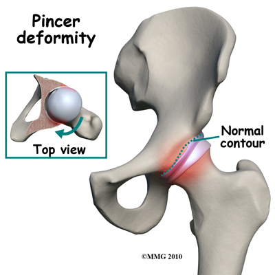 Pincer-type impingement is usually caused by some other problem. It could be as a result of 1) hip dysplasia, 2) a complication after osteotomy surgery (cutting away bone) to correct hip dysplasia, or 3) an abnormal position of the acetabulum called retroversion. Hip dysplasia is a deformity of the hip (either of the femoral head or the acetabulum, or both) that can lead to hip dislocation.
