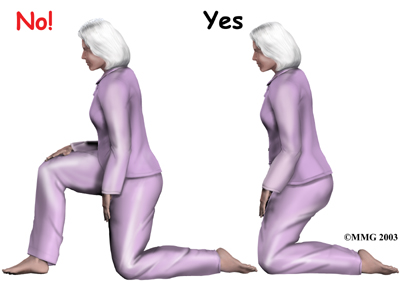- Don't kneel only on one knee. Kneeling only on the surgical hip stretches the hip back. Use both knees when you must kneel down.
