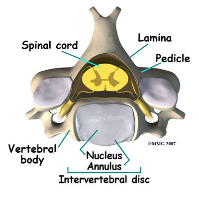 Each vertebra is made of the same parts. The main section of each cervical vertebrae, from C2 to C7, is formed by a round block of bone, called the vertebral body. A bony ring attaches to the back of the vertebral body. This ring has two parts. Two pedicles connect directly to the back of the vertebral body. Two lamina bones join the pedicles to complete the ring. The lamina bones form the outer rim of the bony ring. When the vertebrae are stacked on top of each other, the bony rings form a hollow tube that surrounds the spinal cord. The laminae provide a protective wall around the spinal cord.