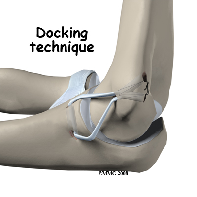 One common technique used to replace the damaged ulnar collateral ligament is called the docking technique. The surgeon drills two holes in the ulna and three in the medial epicondyle ( the small bump of bone on the inside of the elbow at the end of the humerus). The two holes in the ulna form a tunnel that the tendon graft will be looped through. The three holes in the medial epicondyle form a triangle. The bottom hole will be bigger than the top two holes, so that the surgeon can slide the end of the tendon graft into the bottom hole. The two top holes are used to pull the tendon graft into the tunnel using sutures that are attached to the graft and threaded through the two holes.