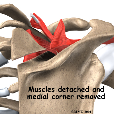 The tissues that attach muscles to the upper part of the scapula are carefully detached and moved out of the way. Then the surgeon uses a special tool to: