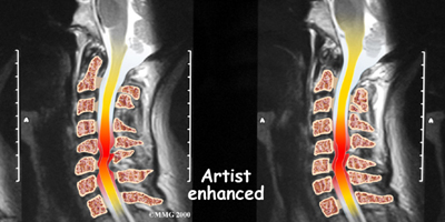 If more information is needed, your doctor may order an MRI. The MRI machine uses magnetic waves rather than x-rays to create pictures of the cervical spine in slices. MRIs show the cervical spine vertebrae, as well as the soft tissue structures, such as the discs, joints, and nerves. MRI scans are painless and don't require needles or dye. MRI scan has become the most common test to look at the cervical spine after x-rays have been taken.