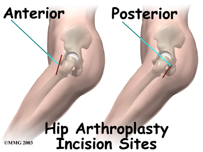 When the surgeon opens the hip joint capsule on the front edge, the procedure is called an anterior approach. Opening the joint from the back part of the joint is called a posterior approach.