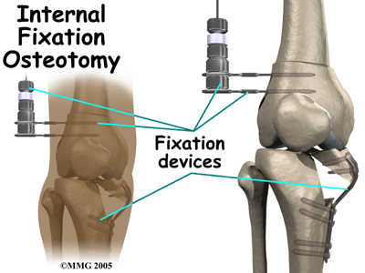 A tibial osteotomy is done before permanent damage occurs. In an osteotomy, a wedge-shaped piece of bone is removed from the medial side of the femur (thigh bone). It's then inserted into the tibia to replace the broken down inner edge of the bone. Hardware such as pins and screws may be used to hold everything in place. If the fixation is used inside the leg, it's called internal fixation osteotomy. External fixation osteotomy describes a special circular wire frame on the outside of the leg with pins to hold the device in place.