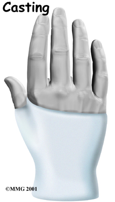 If the bone is in good alignment, and there are no problems with the blood supply to the bone, you may be placed in a cast for nine to 12 weeks. Some doctors prefer to start with a long-arm cast. Others use a thumb-spica cast designed to keep the wrist and thumb from moving.