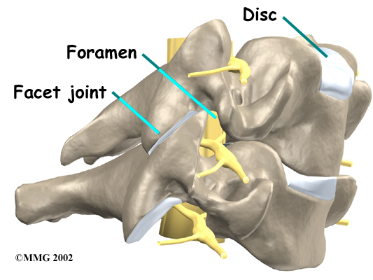 The intervertebral disc sits directly in front of the opening. A bulged or herniated disc can narrow the opening and put pressure on the nerve. A facet joint sits in back of the foramen. Bone spurs that form on the facet joint can project into the tunnel, narrowing the hole and pinching the nerve.