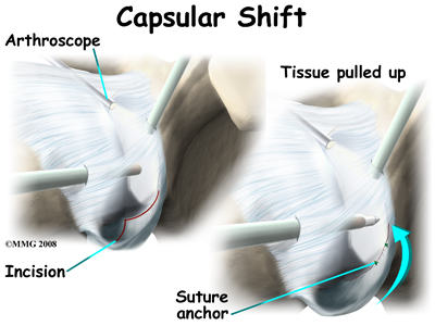This procedure also can be performed using the arthroscope. The surgeon pulls the flap of tissue over the front of the capsule and connects it together. This is similar to when a tailor tucks loose fabric by overlapping and sewing the two parts together. Once the appropriate degree of tightness is achieved, the surgeon uses a combination of sutures and suture anchors to hold the joint capsule in this position until healing occurs.