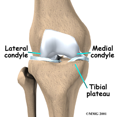 The knee joint is formed where the thighbone (femur) meets the shinbone (tibia). Two bony knobs on the end of the femur, called condyles, sit on the top surface of the tibia. The inside condyle (the one closest to the other knee) is called the medial femoral condyle. The lateral femoral condyle is on the outer half of the femur (farthest from the other knee). The top of the tibia bone forms a flat surface called the tibial plateau.