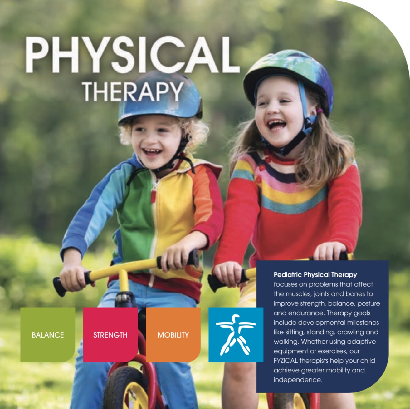 Our Pediatric FYZICAL Therapists provide skilled evaluation and treatment for children of all ages to help them achieve independent and functional mobility skills. The evaluation consists of a parent interview, standardized testing, informal assessment, and play-based interaction to determine the child’s current gross motor abilities. Treatment sessions are individualized and focused on improving balance, postural strength, and motor skills. Home exercise programs are also provided to promote carryover of skills.