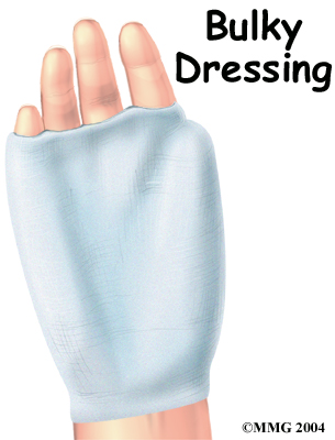 At first, take time during the day to support your healing arm with your hand elevated above the level of your heart. You may be instructed to put an ice pack on your wrist several times a day to keep swelling down. At various times during the day, move your thumb and fingers five to 10 times. Also, bend and straighten your elbow and lift and lower your shoulder occasionally to keep these joints limber. Keep the dressing on your hand until you return to the surgeon. Avoid getting the stitches wet. Your stitches will be removed 10 to 14 days after surgery.