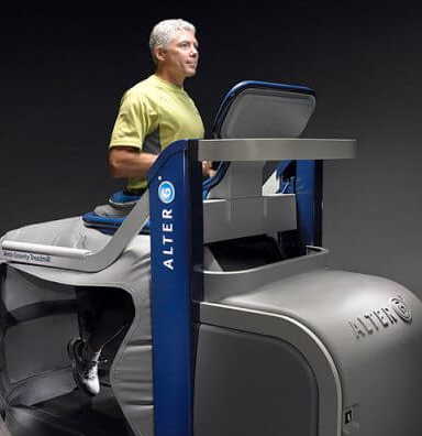 Approved by the FDA as a medical device, the AlterG is a high-tech treadmill developed by NASA. It uses a differential air pressure regulation system, which surrounds the user and lifts them up to reduce ground reaction and lower quarter impact forces during weight-bearing exercise. The AlterG can reduce the weight of the user by as much as 80% (in precise 1% increments). People who use the AlterG say that it is like “running on air.