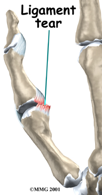 When the collateral ligaments actually tear, the MCP joint becomes very unstable. It is especially unstable when the thumb is bent back. If one of the ligaments pulls away from the bone and folds backwards, it won't be able to heal in the correct position. When this happens, surgery is needed to fix the ligament.