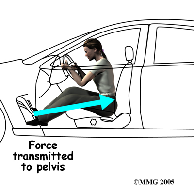 Injury to the SI joint is thought to be a common cause of pain. Injury can occur during an automobile accident. One common pattern of injury occurs when the driver of a vehicle places one foot on the brake before a collision. The impact through the foot on the brake is transmitted to the pelvis causing a twisting motion to this side of the pelvis. This can injure the SI joint on that side resulting in pain. A similar mechanism occurs with a fall on one buttock. The force again causes a twisting motion to the pelvis and may injure the ligaments around the joint.