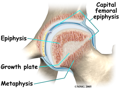 In the growing child, there are special structures at the end of most bones called growth plates. The growth plate is sandwiched between two special areas of the bone called the epiphysis and the metaphysis. The growth plate is made of a special type of cartilage that builds bone on top of the end of the metaphysis and lengthens the bone as we grow. In the hip joint, the femoral head is one of the epiphyses of the femur. The capital femoral epiphysis is somewhat unique. It is one of the few epiphyses in the body that is inside the joint capsule. (The joint capsule is the tissue that surrounds the joint.)