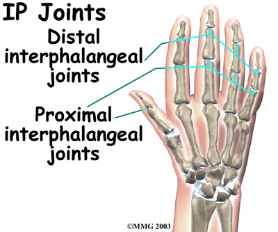 The three phalanges in each finger are separated by two joints, called interphalangeal joints (IP joints). The one closest to the MCP joint (knuckle) is called the proximal IP joint (PIP joint). The joint near the end of the finger is called the distal IP joint (DIP joint). The thumb only has one IP joint between the two thumb phalanges. The IP joints of the digits also work like hinges when you bend and straighten your fingers and thumb.