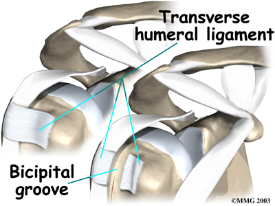 The transverse humeral ligament is split, exposing the bicipital groove. An incision is made along the floor of the bicipital groove. The bleeding from the incision gets scar tissue to form that will help anchor the repaired tendon in place.