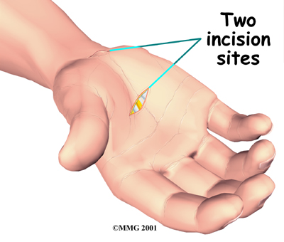 After the carpal ligament is released, the surgeon stitches just the skin openings and leaves the loose ends of the carpal ligament separated to keep pressure off the median nerve. Eventually, the gap between the two ends of the ligament fills in with scar tissue.