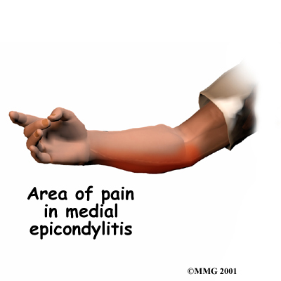 Medial epicondylitis—also known as golfer’s elbow—develops due to inflammation of the tendons that attach the forearm muscles to the inside of the elbow. This type of injury is caused by overuse of the tendons in this region (e.g., repeatedly swinging a golf club). It is associated with tenderness and pain on the inner side of the elbow. Golfer’s elbow can also cause pain in the wrist and hand during movement.