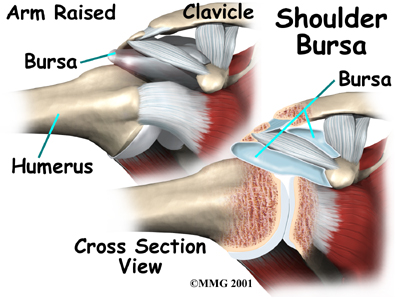 Think of a bursa like this: If you press your hands together and slide them against one another, you produce some friction. In fact, when your hands are cold you may rub them together briskly to create heat from the friction. Now imagine that you hold in your hands a small plastic sack that contains a few drops of salad oil. This sack would let your hands glide freely against each other without a lot of friction.