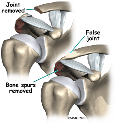 The most common procedure for AC joint osteoarthritis is resection arthroplasty. A resection arthroplasty involves removing a small portion of the end of the clavicle. This leaves a space between the acromion (the piece of the scapula that meets your shoulder) and the cut end of the clavicle, where the joint used to be. Your surgeon will take care not to remove too much of the end of the clavicle to prevent any damage to the ligaments holding the joint together. Usually only a small portion is removed, less than one cm (about three-eighths of an inch). As your body heals, the joint is replaced by scar tissue. Remember, the AC joint doesn't move much, but it does need to be flexible. The scar tissue allows movement but stops the bone ends from rubbing together.