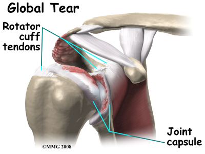 When the rotator cuff is torn, the shoulder becomes unbalanced. The deltoid muscle pulls the head of the humerus up into the acromion in a sliding motion rather than in the smooth balanced movement that the shoulder was designed to undergo. Over time this abnormal sliding motion causes wear and tear on the joint surfaces, which is termed arthritis. Due to the arthritis, motion of the shoulder becomes painful and the shoulder becomes weaker and weaker until you can no longer raise the arm above the head.
