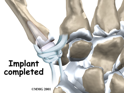 This operation is also combined with a reconstruction of the joint where tendons in the area are used to create a ligament sling between the metacarpal bone of the thumb and the carpal bone of the index finger. This helps hold the thumb in place and keeps the space between the bones from collapsing.