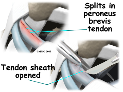 Tendonosis may require repair if a preoneal tendon is split down its length. This type of tear mainly affects the peroneus brevis. The surgeon fixes this problem by first dividing the sheath around the tendons. If the split is smaller than one-third the width of the tendon, the torn portion may simply be removed. Larger splits are sutured along the length of the tendon. The tendon sheath is repaired, and the skin is closed with sutures.