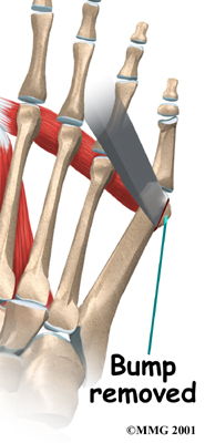 To remove the prominence, the surgeon makes a small incision in the skin over the bump. The bump is then removed with a small chisel, and the bone edges are smoothed. Once enough bone has been removed, the skin is closed with small stitches.