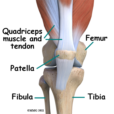 The knee is the meeting place of two important bones in the leg, the femur (the thighbone) and the tibia (the shinbone). The patella (kneecap) is the moveable bone that sits in front of the knee. This unique bone is wrapped inside a tendon that connects the large muscles on the front of the thigh, the quadriceps muscles, to the lower leg bone.