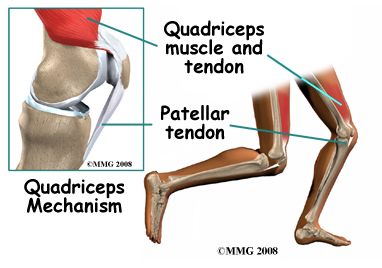 Tightening up the quadriceps muscles places a pull on the tendons of the quadriceps mechanism. This action causes the knee to straighten. The patella acts like a fulcrum to increase the force of the quadriceps muscles.