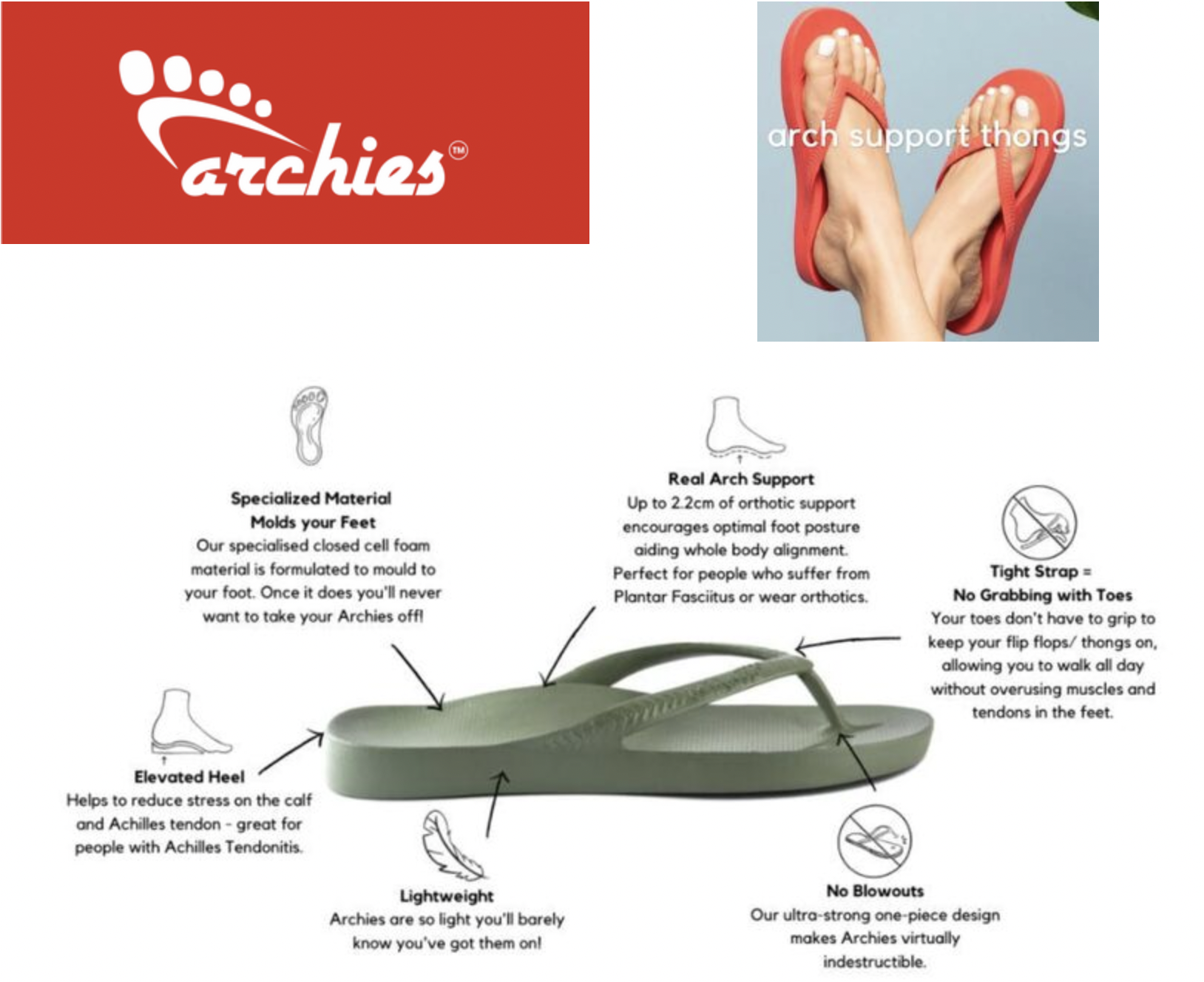 Archies Footwear - designed by a Physical Therapist and fits like an Orthotic. They look just like ‘normal’ flip flops, yet provide the same amount of support as a typical orthotic. Click here to learn more to know more.