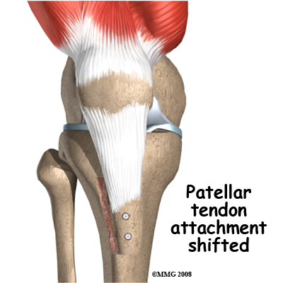 If the misalignment is severe, the bony attachment of the patellar tendon may also have to be shifted to a new spot on the tibia (shin bone.) Remember that the patellar tendon attaches the patella to the tibia just below the knee. By moving a section of bone where the patellar tendon attaches to the tibia, surgeons can change the way the tendon pulls the patella through the femoral groove.