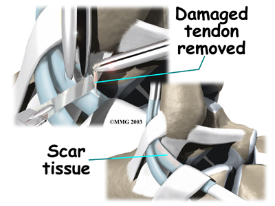 When the lining of the tendon is painful and inflamed (as in tenosynovitis), the goal of surgery is to remove the irritated tissue from around the tendon. This operation is called tendon release. This procedure is done by carefully dividing the tendon sheath that encloses the tendon. Once the sheath is opened, the surgeon clears away the irritated tissues around the tendon. The sheath is not stitched back together. The gap in the sheath will eventually fill in with scar tissue. The skin is closed with sutures.