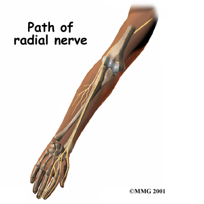 Sometimes a direct blow to the outside of the elbow can injure the radial nerve. Constant twisting movements of the arm, common in assembly work, can also pinch the radial nerve and lead to radial tunnel syndrome.