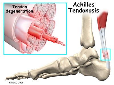Chronic overuse or long term inflammation may contribute to changes in the Achilles tendon, leading to degeneration and thickening of the tendon. As mentioned above, studies show that although inflammation may have contributed to the initial changes in the tendon, there is no acute sign of inflammation in chronically painful tendons. Most experts now refer to this chronic condition as tendonosis or tendinopathy instead of the acute diagnosis of paratendonitis or tendonitis. Acute inflammation, however, is not a precursor to the development of tendonosis. The degeneration and thickening of the achilles tendon that is the hallmark of a tendonosis diagnosis can also develop over time simply from general wear and tear. Tendons are made up of strands of a material called collagen. (Think of a tendon as similar to a nylon rope and the strands of collagen as the individual nylon strands.) Degeneration in a tendon usually shows up as a loss of the normal arrangement of the fibers of the tendon. Some fibers even break (microtears,) and the tendon loses overall strength.
