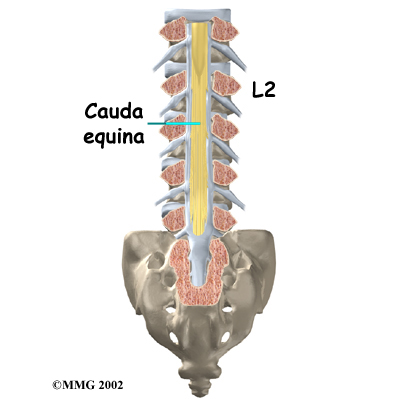 The spinal cord only extends to the second lumbar (low back) vertebra. Below this level, the spinal canal encloses a bundle of nerves that go to the lower limbs and pelvic organs. The Latin term for this bundle of nerves is cauda equina, meaning horse's tail.
