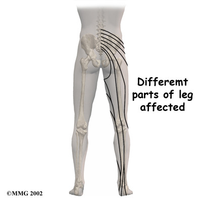 A herniated disc can press against a spinal nerve, producing symptoms of nerve compression. Nerve pain follows known patterns in the lower limbs. It can be felt on the side of the upper thigh, in the calf, or even in the foot and toes.