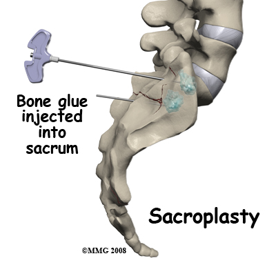 During sacroplasty, a bone glue called polymethylmethacrylate (PMMA) is injected into the fracture. Serious complications can occur if it is not performed correctly.