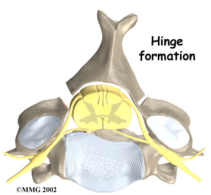 Some surgeons completely remove the entire lamina bone, which is called a total laminectomy. Others prefer to keep the lamina in place by forming a hinge on one edge of the bone. Cutting partially through the lamina on one side forms this hinge. A second cut is made all the way through the lamina on the other side, which is then lifted away from the spinal cord. The hinged side eventually forms a bone union, which holds the opposite side open and keeps pressure off the spinal cord.
