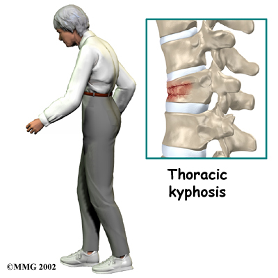 Osteoporosis is a disease that weakens bone. Sometimes the bones in the spine weaken to the point that even mild forces can lead to a compression fracture. A simple action like reaching down to pull on a pair of socks can cause a weakened vertebra to fracture. The front of the vertebra (the part closest to the front of the body) crumbles, causing the round vertebral body to become wedge-shaped. This angles the spine forward, producing a hunch-backed appearance, called kyphosis.