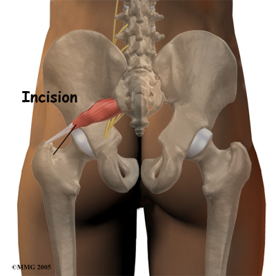 The surgeon begins by making a small incision, usually about three inches long, in the buttock. The fibers of the gluteus maximus, the largest buttock muscle, are split. This gives the surgeon a way to see deep into the buttock and locate the piriformis muscle. When the piriformis muscle and tendon can be seen, the surgeon then cuts (releases) the tendon where it connects to the greater trochanter.