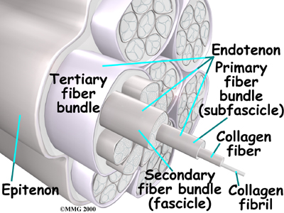 Ligaments are the soft tissues that attach bones to bones. Ligaments are very similar to tendons. The difference is that tendons attach muscles to bones. Both of these structures are made up of small fibers of a material called collagen. The collagen fibers are bundled together to form a rope-like structure. Ligaments and tendons come in many different sizes and like rope, are made up of many smaller fibers. Thickness of the ligament or tendon determines its strength.