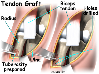 The original attachment on the radius, the radial tuberosity, is prepared by shaving off the surface with a burr. The burr is then used to create a small cavity in the bone for the tendon to fit inside. Two small suture anchors are embedded into the cavity in the radial tuberosity. These anchors can either be screwed into the bone or implanted like a staple. Each anchor has a long thread (suture) connected to it. The suture is woven into the lower end of the tendon and crisscrossed upward. The surgeon slides the sutures back and forth, which coaxes the end of the tendon into the cavity. When the end of the tendon is positioned in the cavity, the surgeon tightens the sutures, fixing the tendon in place.