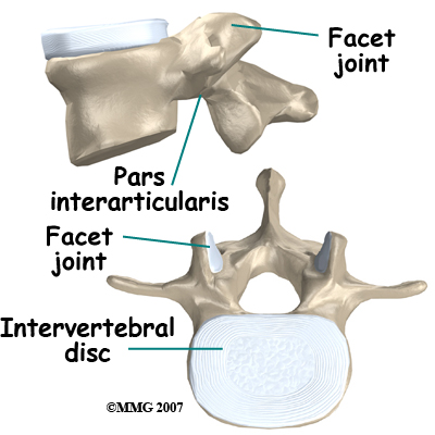 Facet joints are small joints on either side of the spine that allow motion. As the bones of the spine interlock, a facet joint is formed. Each vertebra will form two facet joints, on either side. There is a pair at the top and a pair at the bottom of each vertebra. The area of the vertebra that connects the large body of the vertebra to the facet joints is called the pars articularis or pedicle.